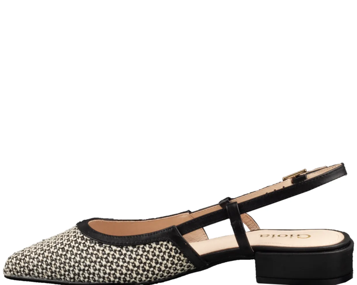 Gioia Slings. Deze Gioia Wopke Slings zijn vervaardigd uit een combinatie van materialen en hebben een binnenvoering van leer. Deze trendy dames slings zijn agewerkt met een gespsluiting en een hak met een hakhoogte van ongeveer 2 cm