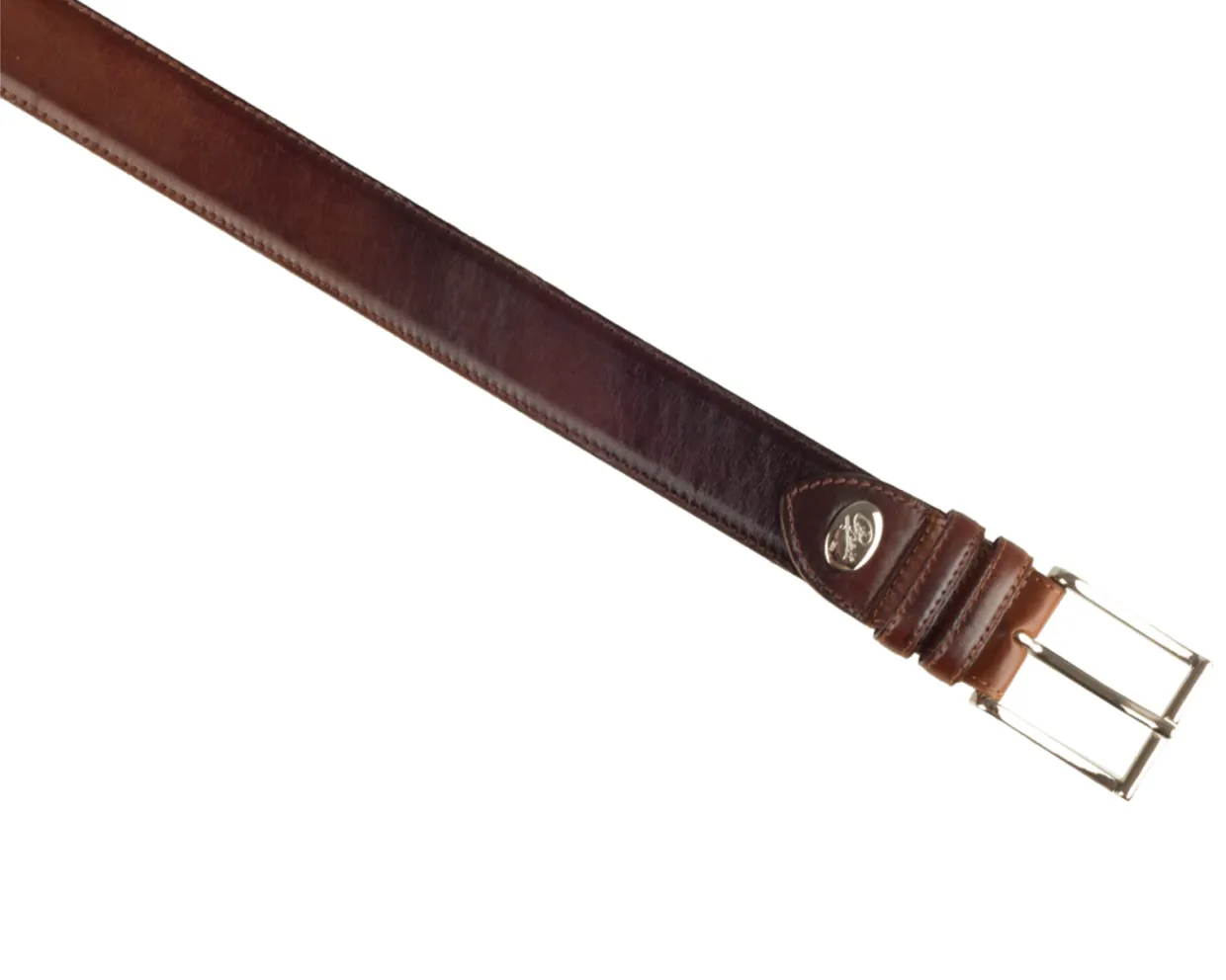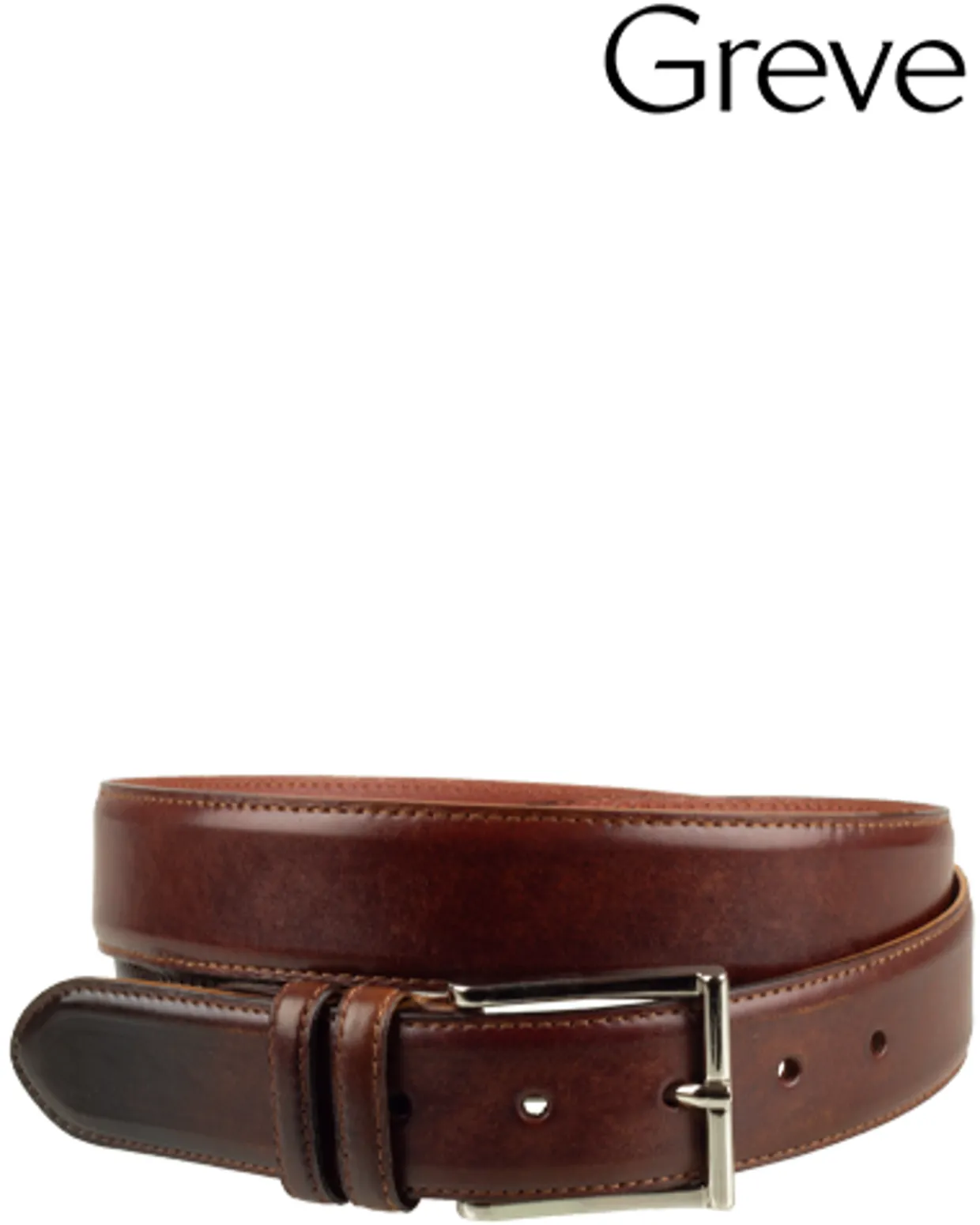 Greve herenriem. Deze cognac Greve 9 riem is vervaardigd uit leer en heeft een zilverkleurige gespsluiting.
