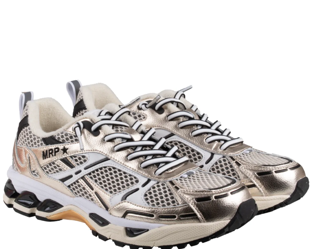 MRP sneakers. Deze MRP Amsterdam sneakers zijn vervaardigd uit een combinatie van materialen en hebben een textiele binnenvoering. De goud gekleurde trendy dames sneakers zijn voorzien van veters, een uitneembaar voetbed en een rubberen loopzool. Verkrijgbaar in