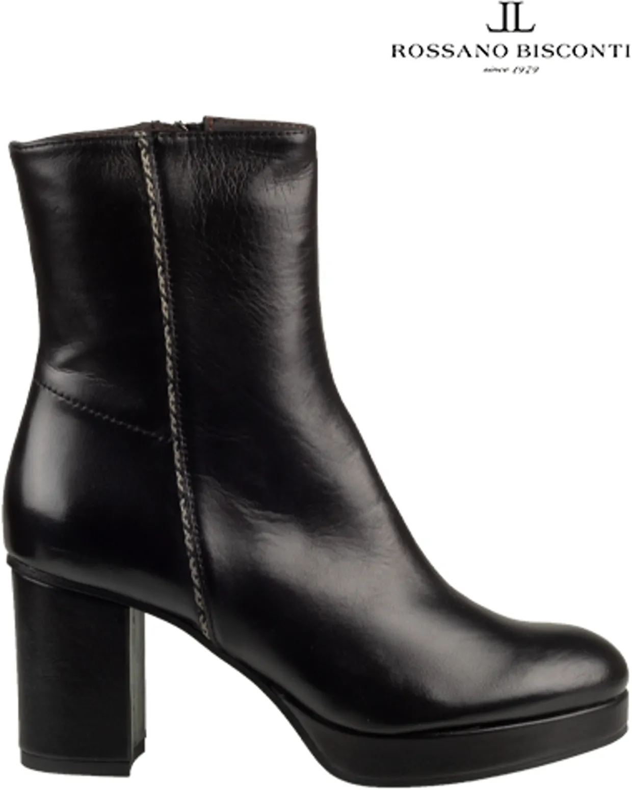 Rossano Bisconti enkellaarzen. Deze Rossano Bisconti 776-02 enkellaarzen zijn vervaagd uit leer en hebben een leren binnen voering. De Stijlvolle enkellaarzen hebben een hakhoogte van 5 cm en zijn afgewerkt met een rubberen loopzool en een rits. Verkrijgbaar in zwart en cognac.
