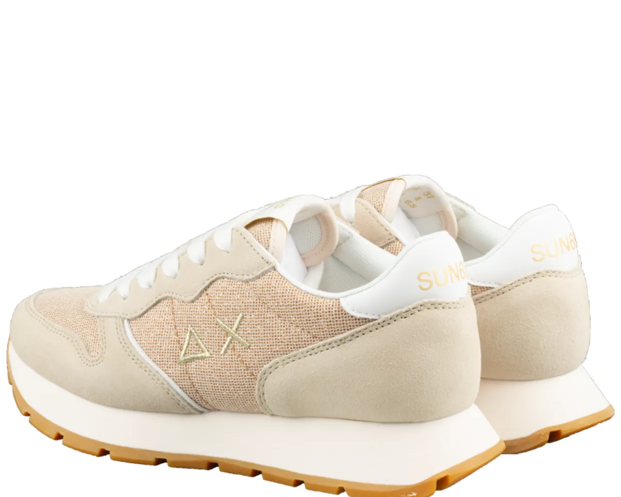 Sun 68 sneakers. Deze Sun 68 Ally Glitter Text sneakers zijn vervaardigd uit een combinatie van materialen en hebben een textielen binnenvoering. De wit trendy dames sneakers zijn voorzien van veters, een uitneembaar voetbed en een rubberen loopzool. Verkrijgbaar in wit en goudkleurig.