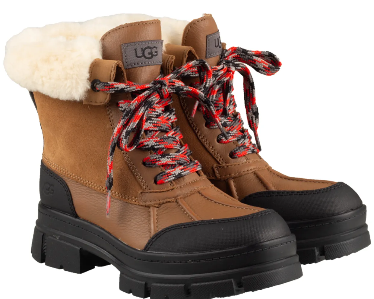 UGG Ashton schoenen. Deze UGG Ashton Addie winter boots zijn vervaardigd uit een combinatie van materialen en hebben een binnenvoering van zacht imitatiebont. De cognac veterboots zijn voorzien van een rubberen loopzool. Deze waterbestendige UGG laarzen zijn geschikt voor lage temperaturen tot wel -20 °C.