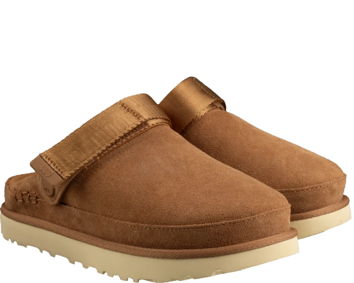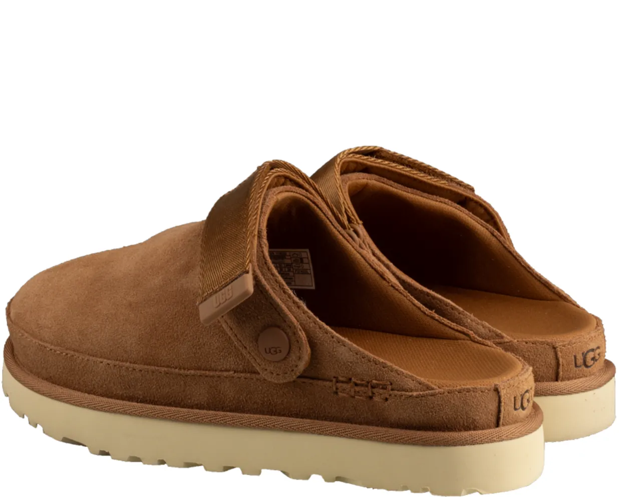 UGG Slippers. Deze UGG Golden Star Clog Slippers zijn vervaardigd uit suede en hebben een binnenvoering van textiel. De trendy, dames slippers zijn afgewerkt met een klittenband sluiting en een rubberen loopzool. Verkrijgbaar in de kleuren cognac en zand/beige.