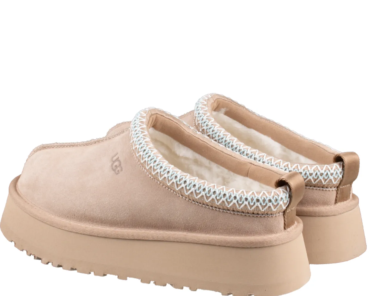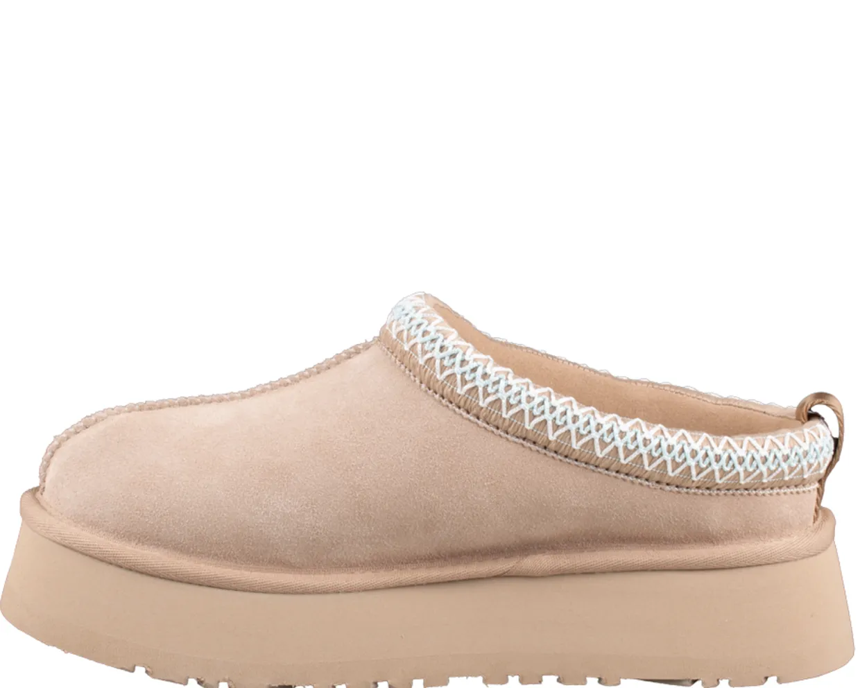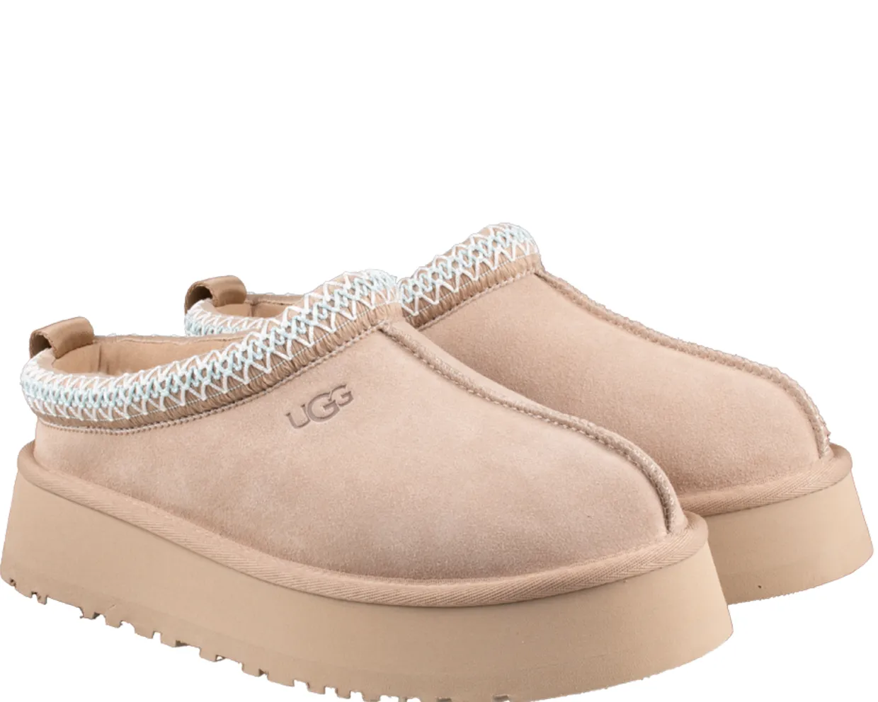 UGG Tazz pantoffels. Deze UGG tazz schoenen zijn vervaardigd uit licht beige suède. Deze trendy pantoffels hebben een binnenvoering gemaakt van schapenwol en lyocell. Dit model heeft de kenmerkende platform loopzool.