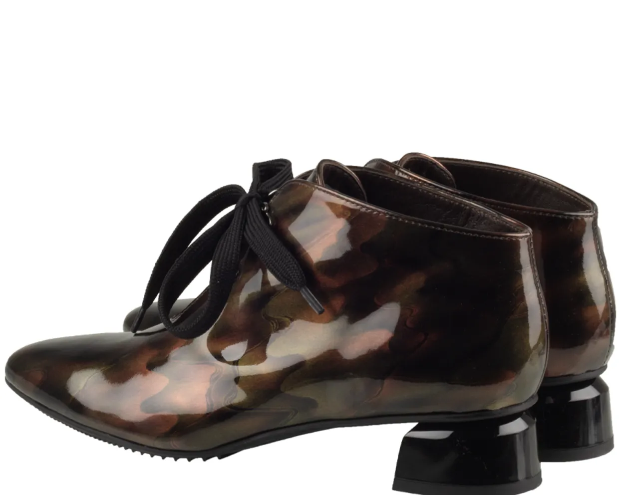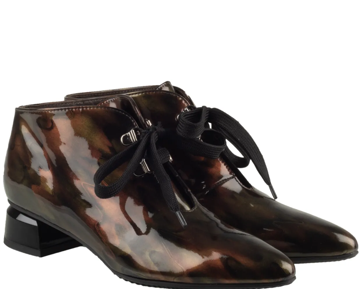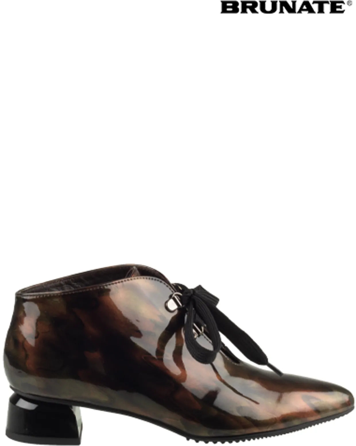 Brunate enkellaarzen. Deze Brunate 38312 Enkellaarzen zijn vervaardigd uit lak leer en hebben een binnenvoering van leer. De bruine, trendy dames enkellaarzen zijn afgewerkt met een rubberen loopzool, een vetersluiting en een hak met een hakhoogte van ongeveer 3 cm.