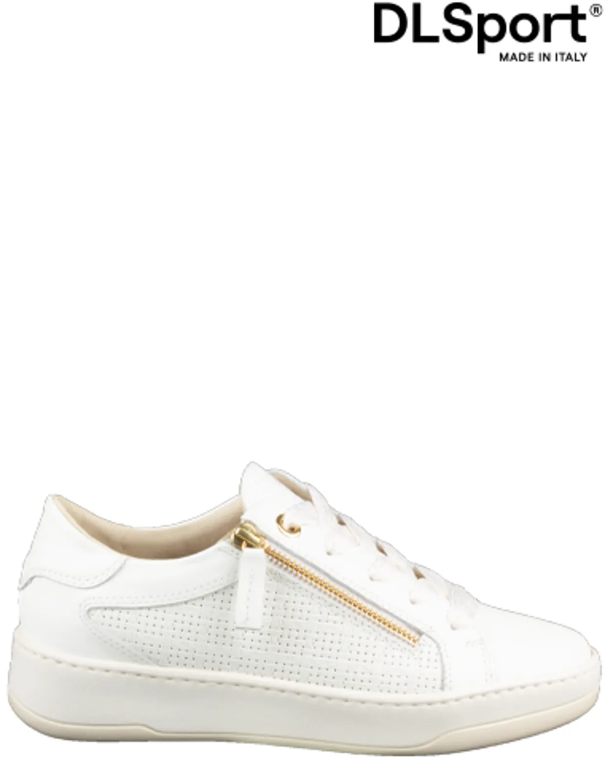 DL Sport sneakers. Deze DL Sport 6516 sneakers zijn vervaardigd uit leer en hebben een leren binnenvoering. De witte trendy dames sneakers zijn voorzien van veters, een uitneembaar voetbed en een rubberen loopzool. Verkrijgbaar in wit en goud.