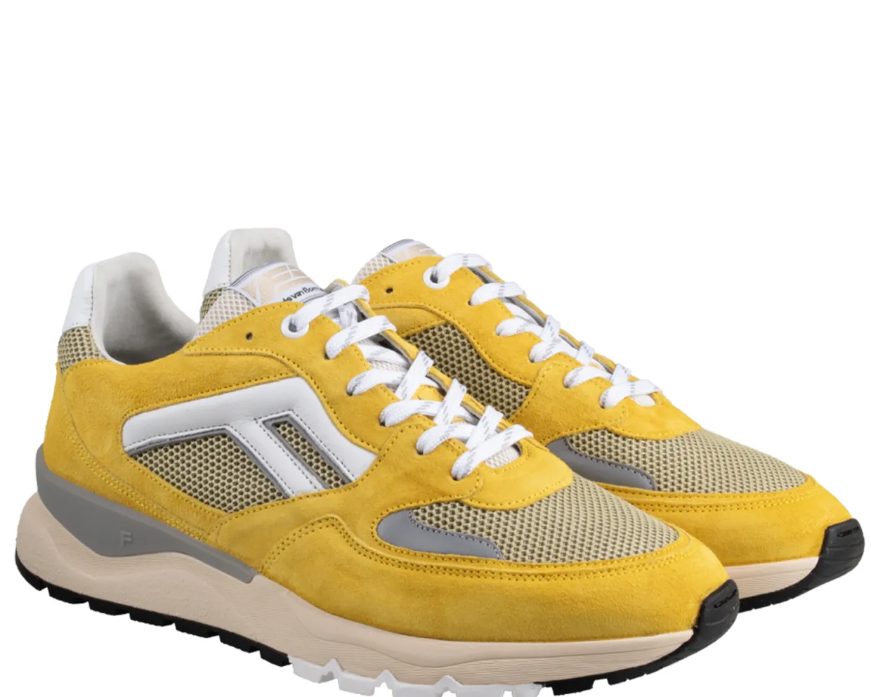 Floris van Bommel Sneakers. Deze Floris van Bommel De Treener 01.05 Sneakers zijn vervaardigd uit uit een combinatie van materialen en hebben een binnenvoering van leer. Deze gele, sportieve heren sneakers zijn afgewerkt met een uitneembare voetbed en een rubberen loopzool.