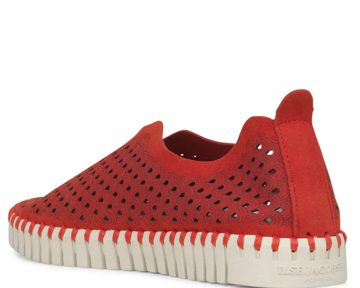 Loafers van het Deense merk Ilse Jacobsen. Deze Ilse Jacobsen Tulip 3275 loafers zijn vervaardigd uit gerecyclede microvezel met een perforatie en zijn verkrijgbaar in de kleuren zwart, licht-bruin, geel/oker, oranje, groen, rood en blauw. Deze flexibele loafers hebben een rubberen loopzool met profiel. De Ilse Jacobsen loafers hebben een uitneembaar voetbed.
