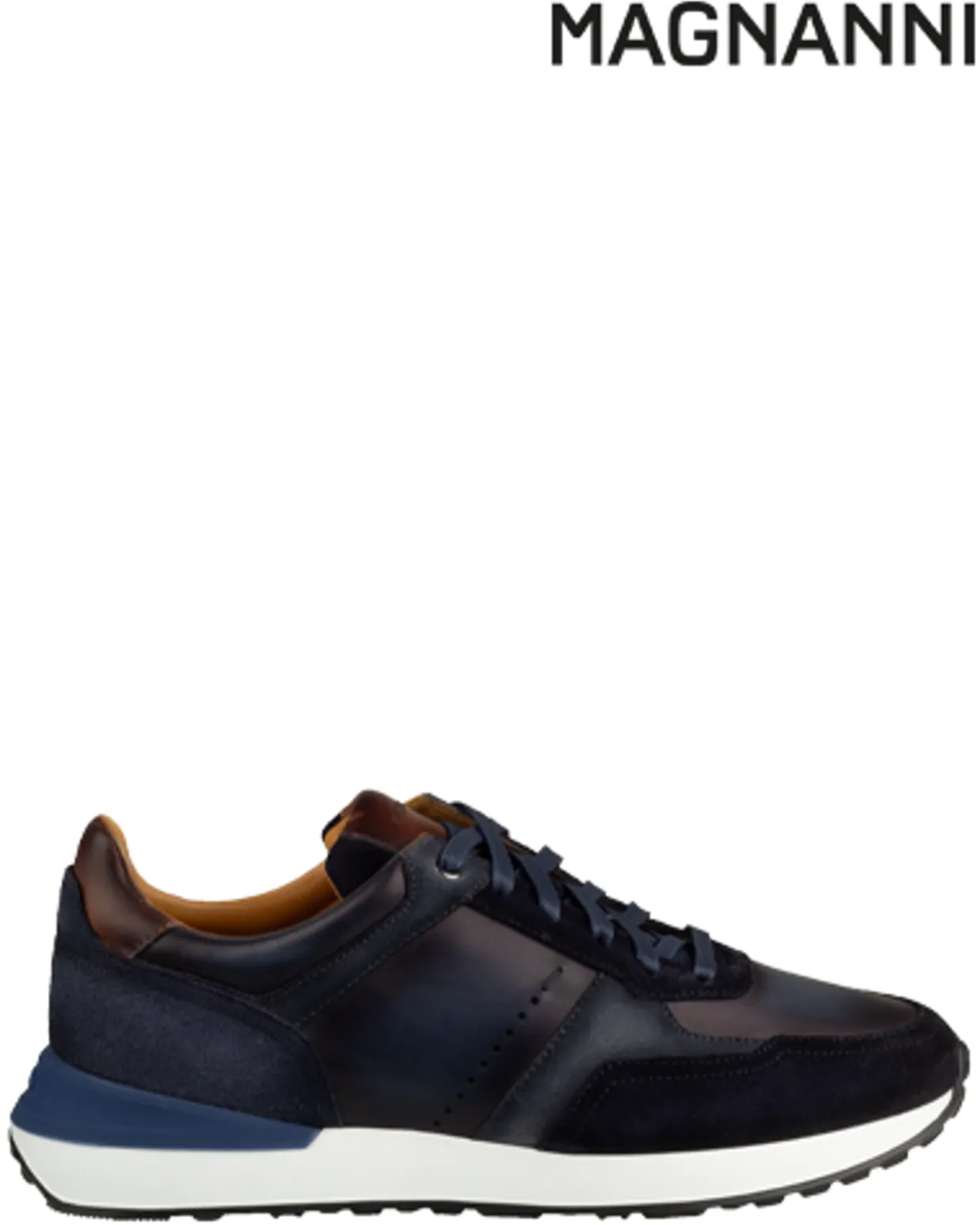 Magnanni Sneakers. Deze Magnanni 24747 Sneakers zijn vervaardigd uit een combinatie van leer en suede en heeft een binnenvoering van leer. De blauwe, sportieve heren sneakers zijn afgewerkt met een vetersluiting, een rubberen loopzool en een uitneembaar voetbed.